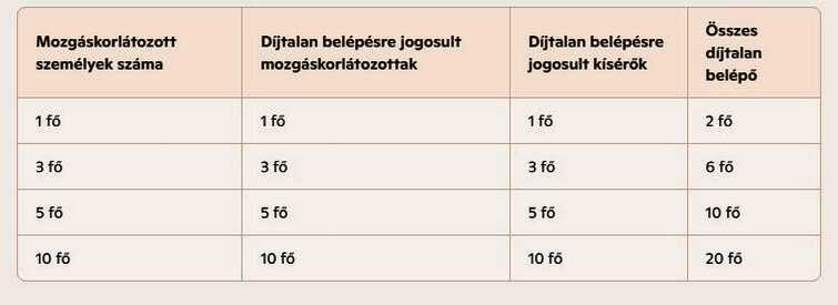 .Ha például 10 mozgáskorlátozott látogató érkezik, akkor mind a 10 fő díjtalanul beléphet.